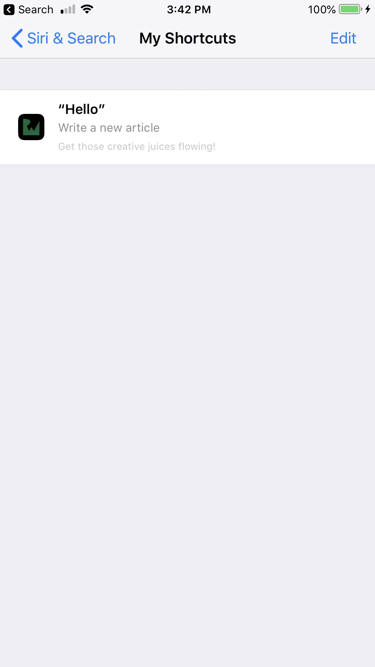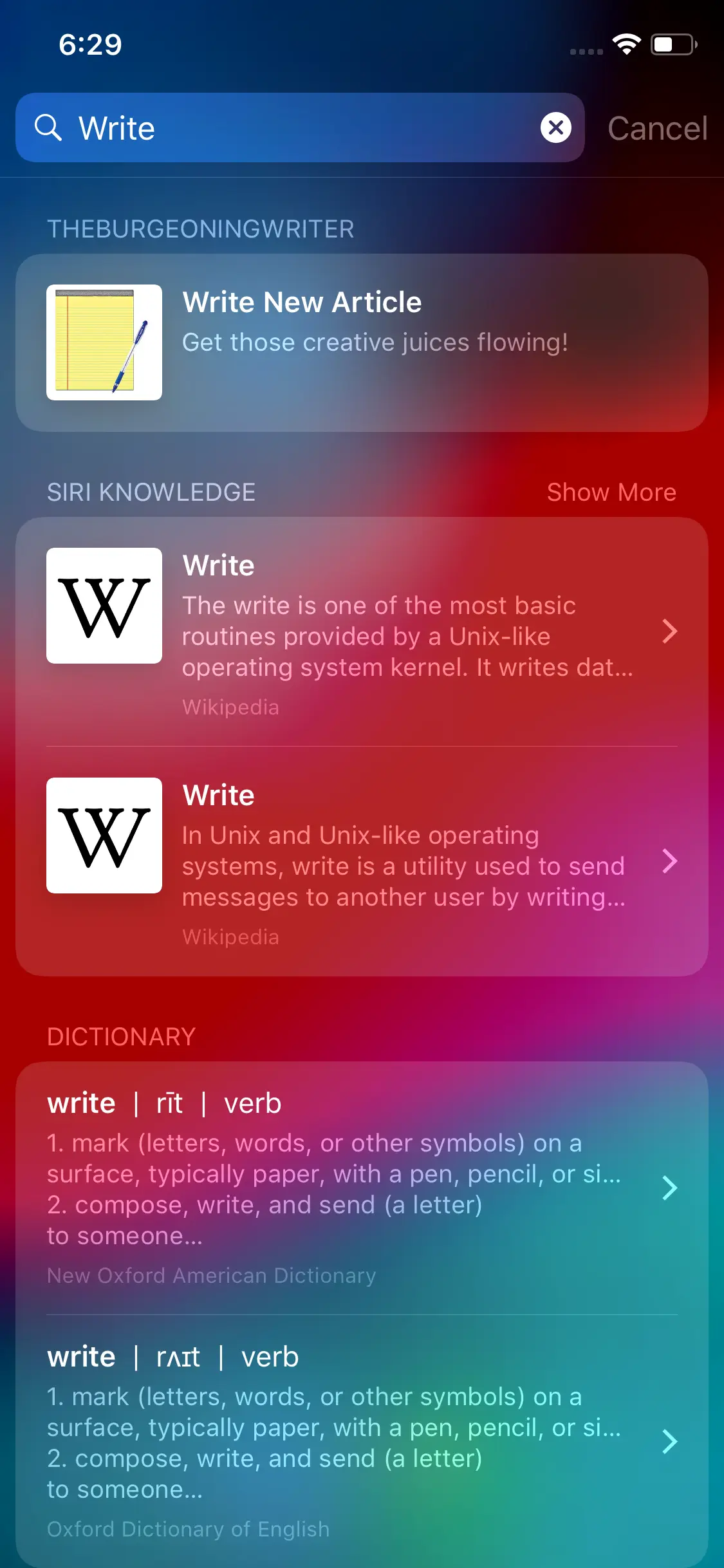 要验证,请在主屏幕上下拉以进行搜索。 然后,键入“write”,您应该会看到Write a new article操作。