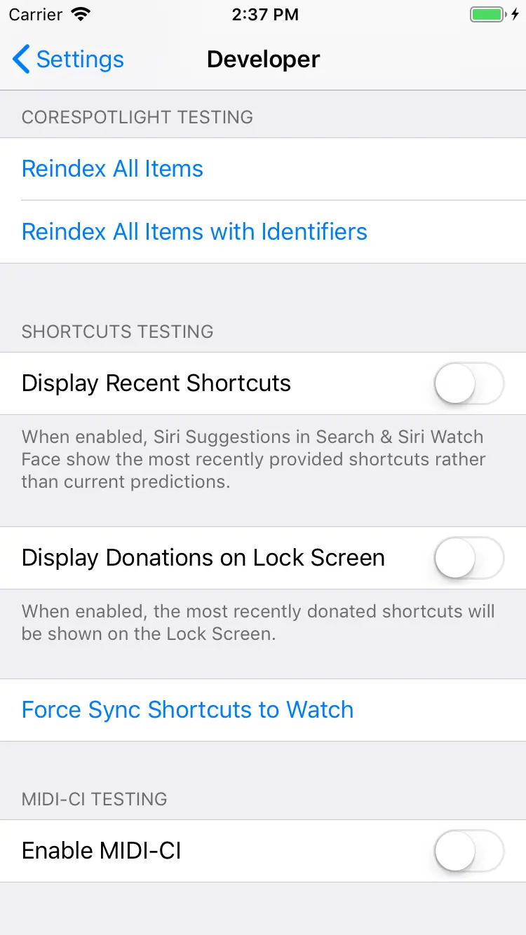 打开Settings并找到Developer选项 滚动到底部,您将看到名为SHORTCUTS TESTING的部分。