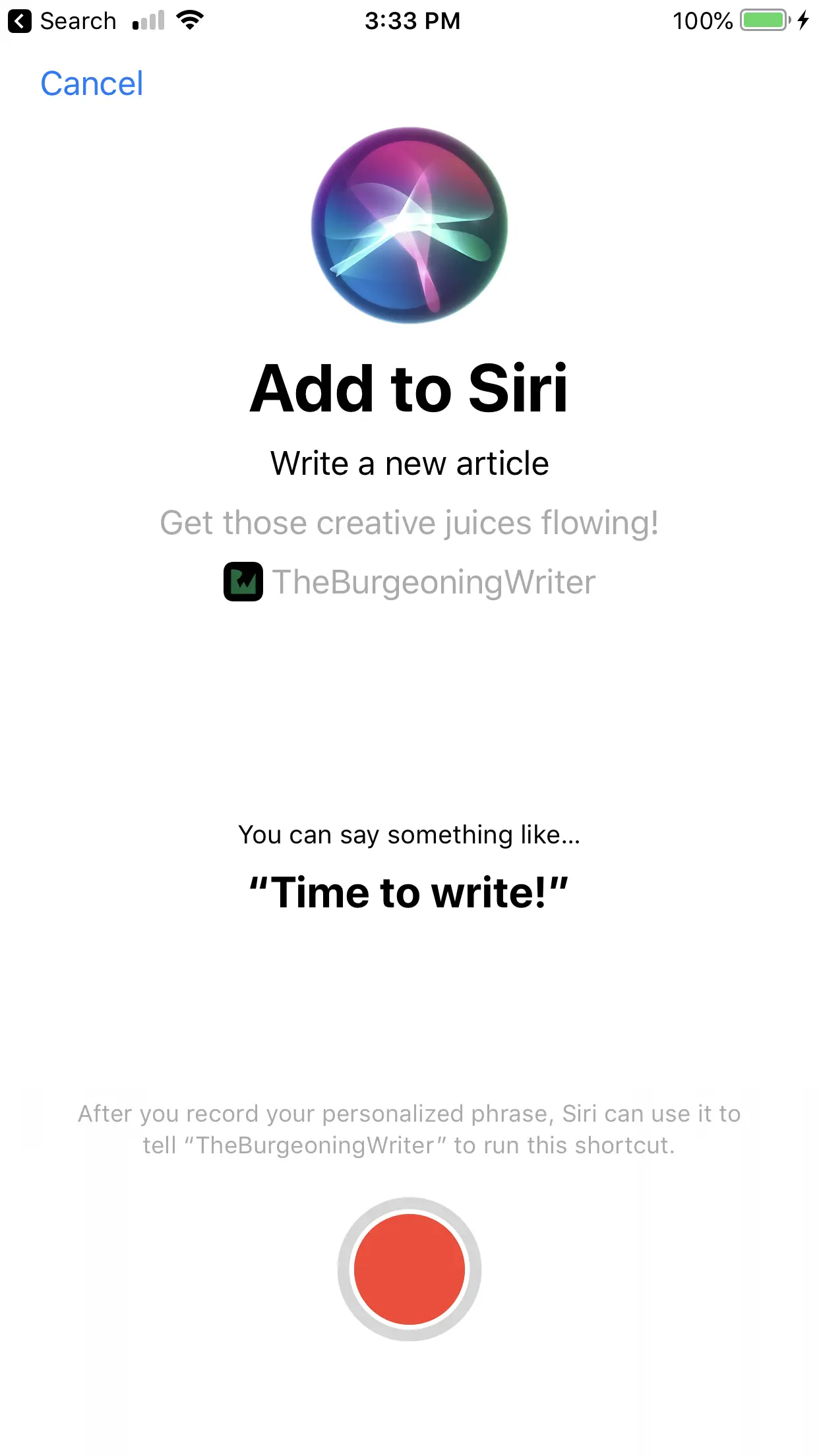 点按底部的红色圆圈。 当提示时,请告诉Siri,“Time to write”。 在Siri确定您所说的内容后,点按Done以完成您的快捷方式。