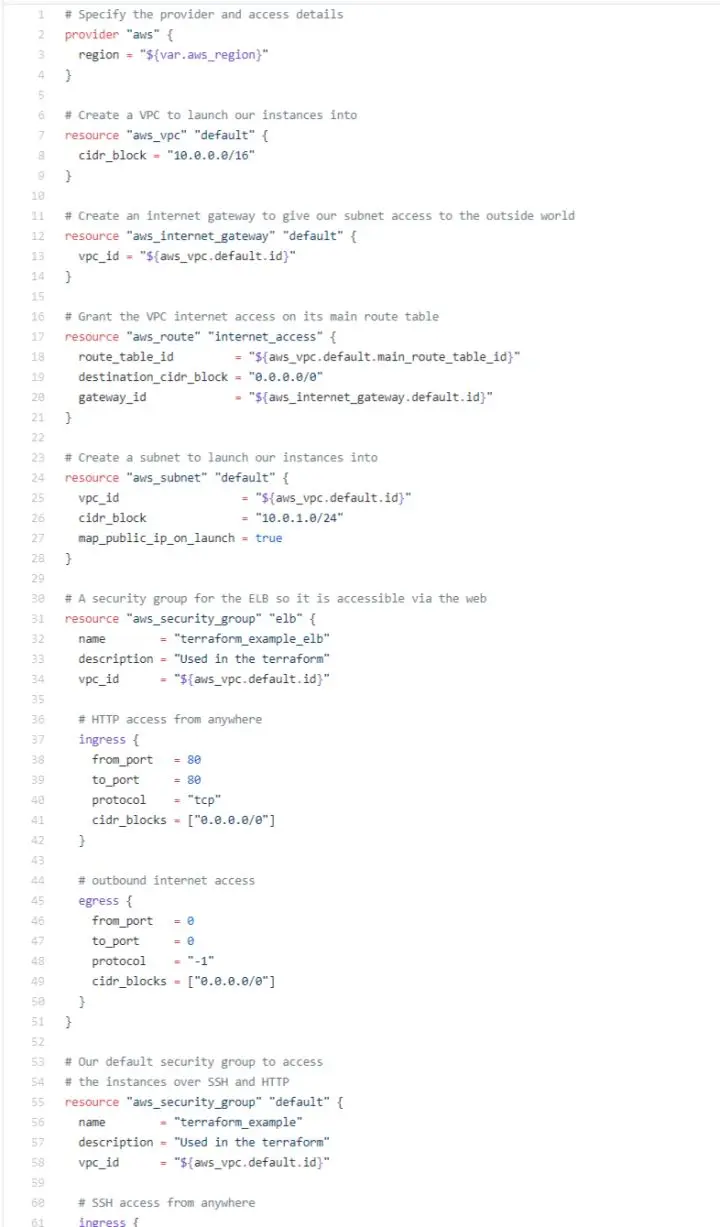 这有一个简单的 Terraform 脚本用来在 AWS 上创建一个双层基础设施的简单示例,包括虚拟私有云(VPC)、弹性负载(ELB),安全组和一个 NGINX 服务器。Terraform 是一个通过脚本创建和更改基础设施架构和开源工具。