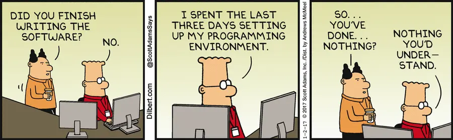 Too bad the setup only worked on first glance. During the following weeks, you will have to solve smaller issues here and there and add some tools that were not listed. Maybe debugging doesn’t work yet, or you don’t see the sources from upstream dependencies. Eventually, it smoothes out. Only when a colleague changes something in the requirements, it usually takes two days until the whole team has noticed and changes their environments accordingly.