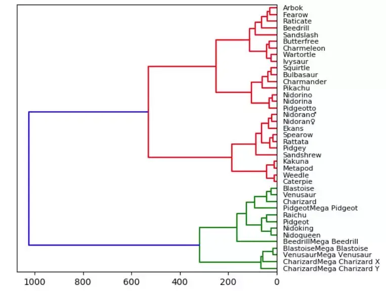 因此,统计意义上最匹配的口袋妖怪将被紧密地连接在一起。例如,在图的顶部,阿柏怪 和尖嘴鸟是直接连接的,如果我们查看数据,阿柏怪的总分为 438,尖嘴鸟则为 442,二者非常接近!但是如果我们看看拉达,我们可以看到其总得分为 413,这和阿柏怪、尖嘴鸟就具有较大差别了,所以它们在树状图中是被分开的!当我们沿着树往上移动时,绿色组的口袋妖怪彼此之间比它们和红色组中的任何口袋妖怪都更相似,即使这里并没有直接的绿色的连接。
