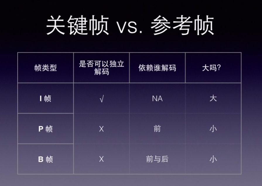 一个公式: GOP = I(帧内编码帧) + B(双向预测帧) + P(前向预测帧) 其中I帧也叫关键帧,是一副完整的画面,而P帧则是记录I帧的变化(H.264中通过补偿算法根据I帧得到的差异文件),B帧类似。 再简单点说,如果没有I帧,P帧和B帧也无法解码。这也很好理解,没有原始对比文件,只有差异文件是无法渲染画面的。 GOP结构一般两个数字,如M=1,N=2。M指定I帧和P帧之间的距离,N指定两个I帧之间的距离,其他都是B帧填充。如M=1,N=2这里的例子是IDR PB I排序。 有些地方会讲IDR帧,其实就是GOP的第一个I帧,这个帧很重要,因为关于首开优化基本上都在去尽可能减小IDR帧的大小。