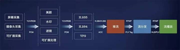 数据采集→数据预处理→数据编码→数据传输(流媒体服务器)→解码数据→直播播放