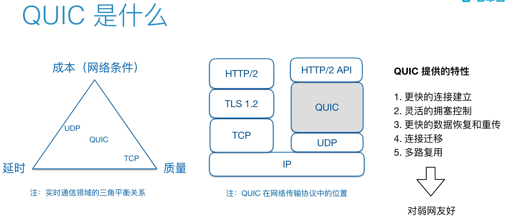 QUIC全称 quick udp internet connection,即“快速 UDP 互联网连接”。是谷歌公司制定的一种基于 UDP 协议的低时延互联网传输协议。使用QUIC推流,针对弱网用户也能够有很好的用户体验。