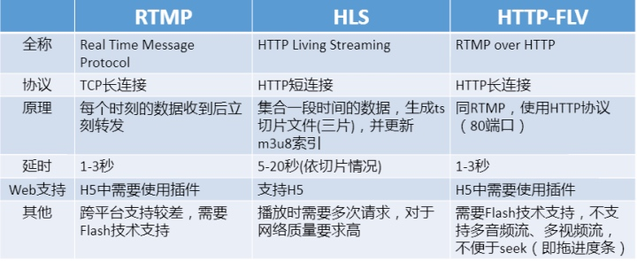 有直播推流到流媒体服务器,那肯定也会有相应的拉流方式。相比较于推流,目前主流的拉流协议有三种:RTMP、HLS、HTTP-FLV。