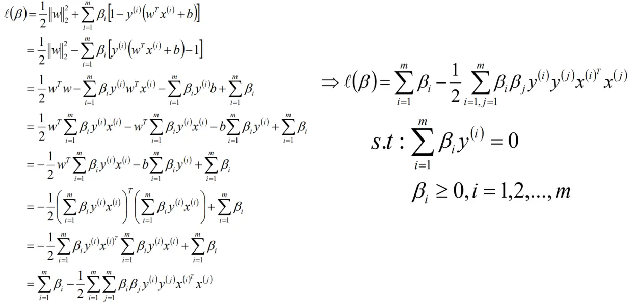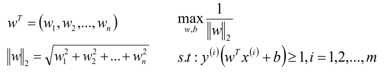 SVM模型 是让所有的分类点在各自类别的支持向量的两边,同时要求支持向量尽可能的远离这个超平面,用__数学公式__表示如下: