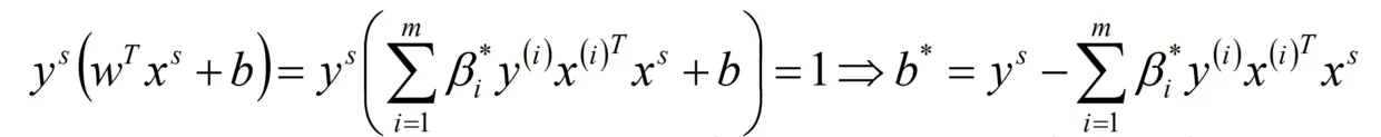 这里的(xs,ys)即__支持向量__,根据KKT条件中的对偶互补条件(松弛条件约束),支持向量必须满足以下公式: