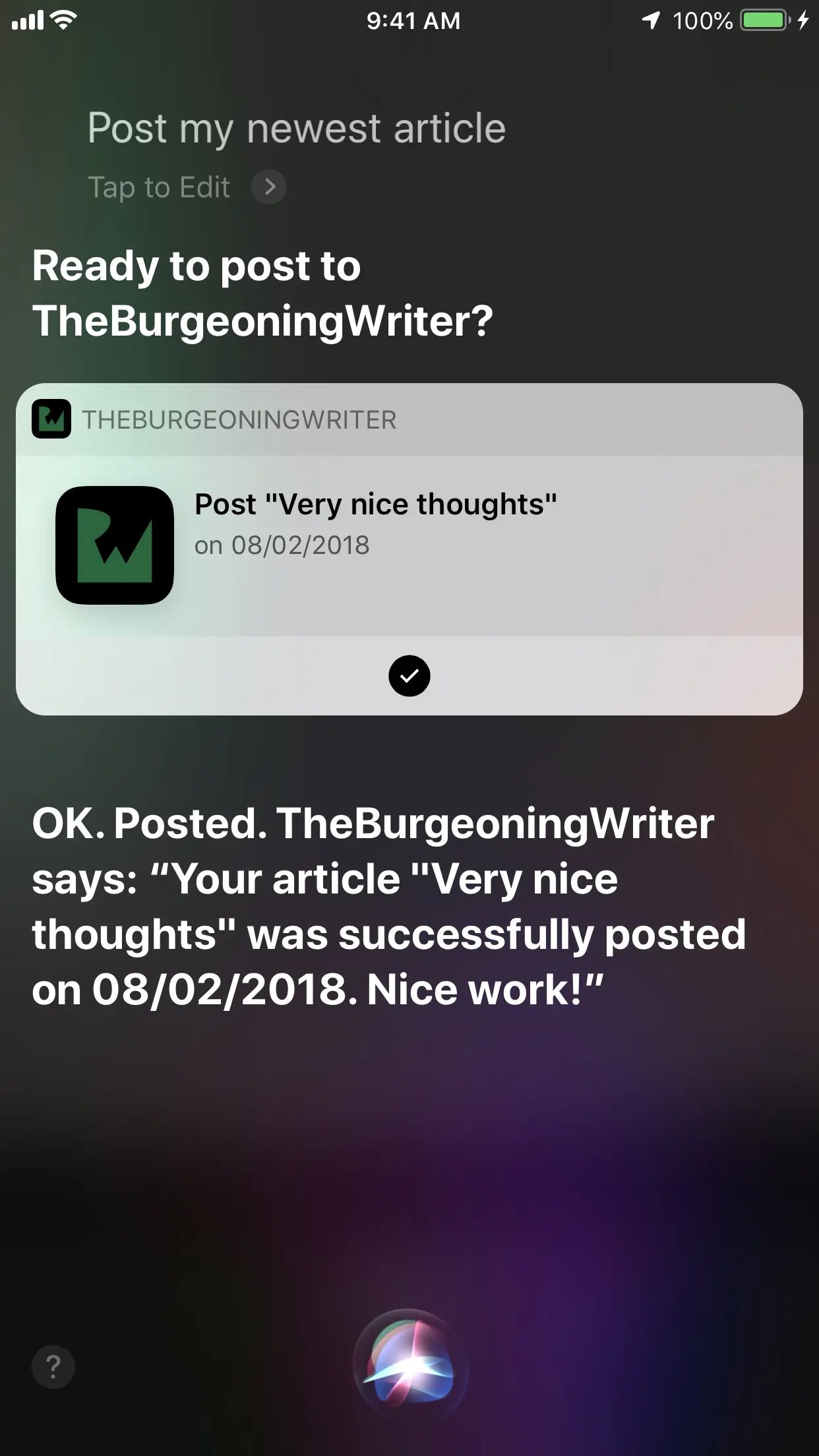 之后,启动Siri并使用您的快捷方式;Siri将为您发布该文章,并回复一个自定义回复,通知您标题和发布日期。