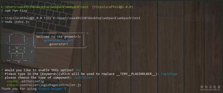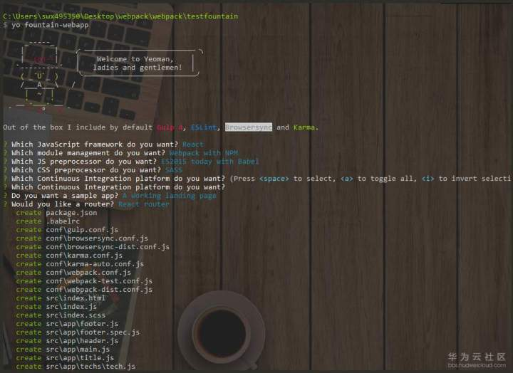 在当前文件夹开启命令行,输入yo XXX(XXX为generator模板后缀的名称,例如yo fountain-webapp),根据交互式命令行信息填写参数,最终即可生成项目目录。