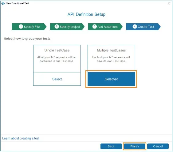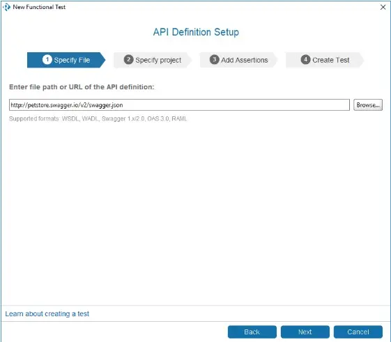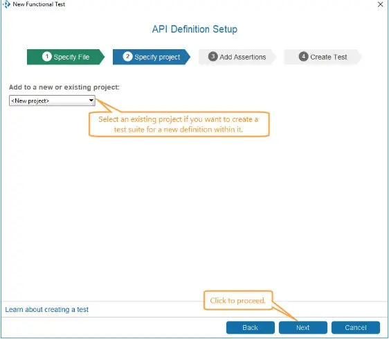 注意:如果工作区中未打开任何项目,则向导将跳过此步骤。在这种情况下,ReadyAPI将创建一个新项目并向其添加新测试。