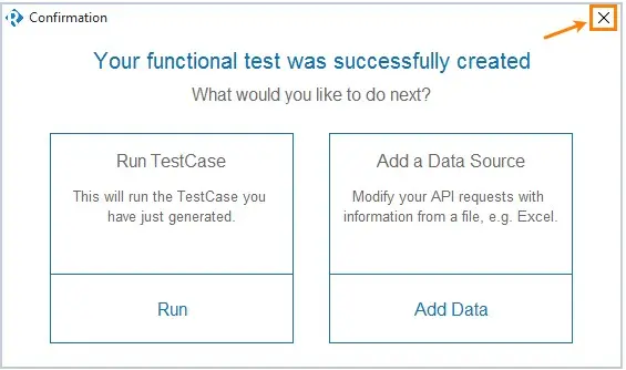 6、ReadyAPI将创建一个测试项目并向其添加测试用例。 之后,它将再显示一个对话框,您可以在其中运行创建的测试或向其添加数据源。在本教程中,我们不会使用这些选项。关闭此对话框: