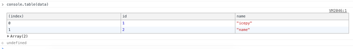 多少情况下我们在开发 Web App 时都是通过数据来驱动的,console.log 虽然可以显示一个完整的对象,我们需要把对象点开,一个一个的查找才能看见,这很不直观,但是我们可以使用 console.table 通过一个表格来显示数据,这真的很一目了然: