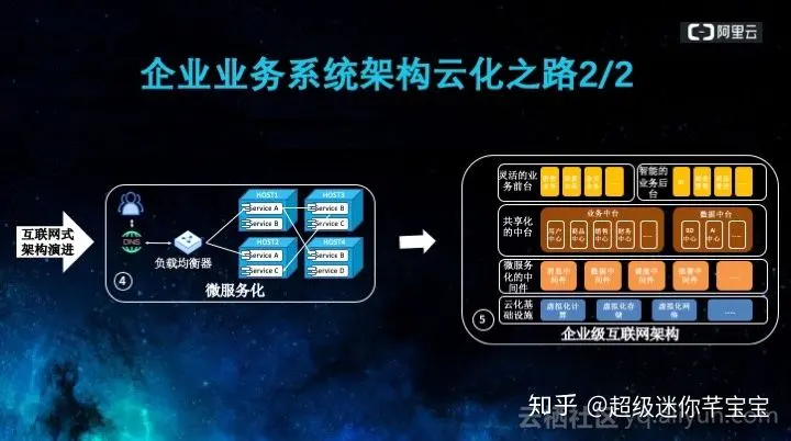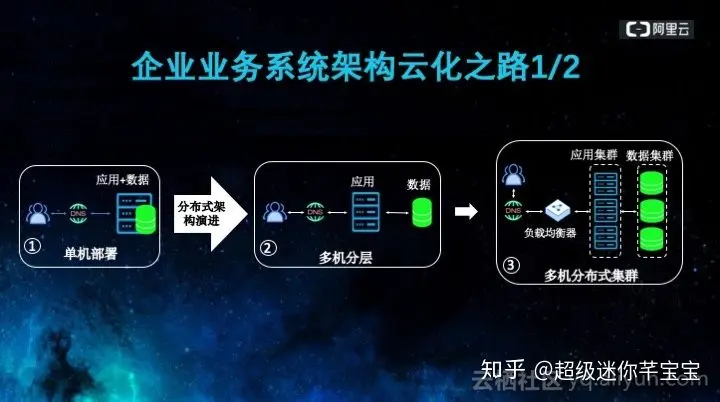 对应阿里云的系统架构转变,最开始的时候业务都是应用和数据一体化的单机部署方式,到后面应用和数据分层、多级分层部署,再到分布式的集群,以及到现在越来越应用广泛的微服务化的改造,在这个过程中可以看到应用和应用之间,应用和数据之间弹性越来越高。