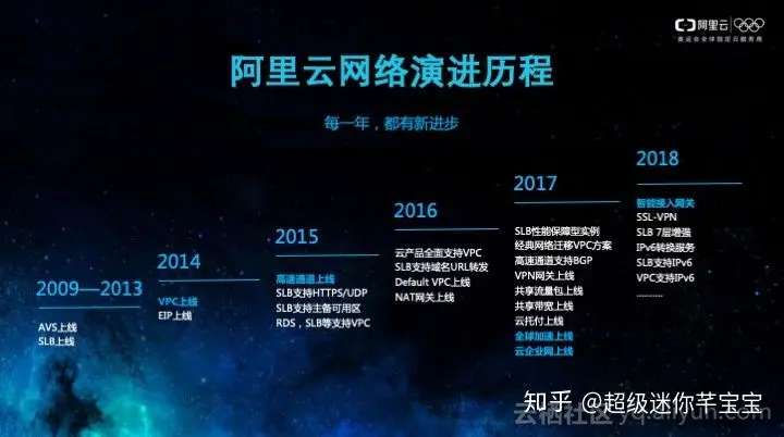 阿里云网络产品推进的时间点跟企业上云的系统基本上保持一致的。最开始只是提供AVS、SLB这些单实例,到后面因为基础实例上云了之后需要云上和云下的高速通道,专线以及智能接入网关,到后面资源的力度越来越细,分布的范围越来越广,阿里云提供了比如说全球加速、云企业网,通过企业架构在云上不停的演进,阿里云网络还将继续推进各种满足客户服务,各种业务系统的网络产品。