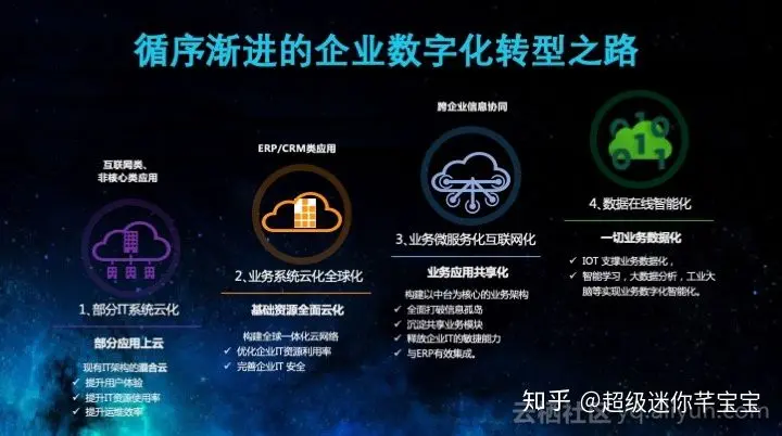 - 到了最后一个阶段,阿里云认为随着企业的业务在云上逐渐运行,收集了大量的一个数据,后面会通过智能学习、大数据分析相关的工具对数据进行智能化的一个分析,用于指导业务更精准的服务,更精准的开展。