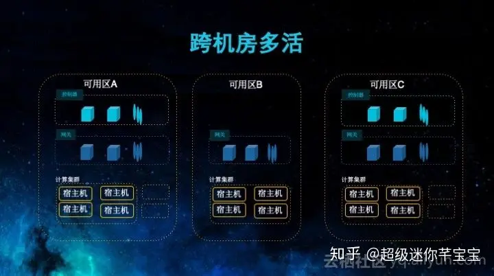 括控制器,包括各种网关,一方面是集群化部署,另外一方面在每一个机房基本上都会部署,节点与节点之间,机房与机房之间会互相备份,当某一个故障洛神会在集群内倒换,如果超过了一定的值会在机房倒换,避免因为单一的一个点或者一个集群故障造成整个网络的不可用。这个实际上是一个跨机房多活的方式。