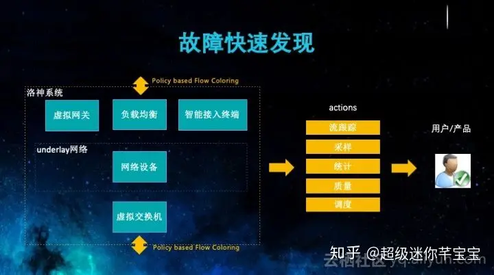 进行染色并且加以匹配,作用于阿里云虚拟网络和物理网络上面。在整个设备的运行过程中会对特定的业务,特定的流染色进行景象采样,打时间搓等等,会进行数据的实时分析。通过数据的实时分析快速发现特定的流的故障,比如说丢包了,立即通知网络管理人员恢复故障,这是我跟我们现在IT的思维基本上一致的,但是阿里云的洛神平台主要是从客户的业务出发。