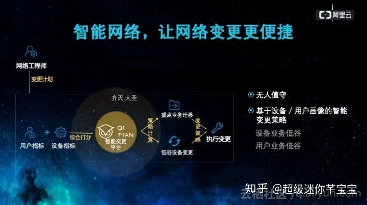 - 变更的案例:大家都知道线上很多的问题都是因为网络的变更导致的,怎么样降低变更时对业务的影响,阿里云一般会选取业务量最小的对客户影响最小的时间点去进行变更。那怎么选择时间点以往会通过人工的方式,这样的话一方面工作量大,另外一方面其实也不精准,对业务的影响是不可知的。阿里云的齐天平台可以通过大数据的分析,精准描绘用户网源的画像,选择业务量最小的时间点进行自动的变更。这样的话大大降低了影响业务运行的概率。另外很多时候要选择版本上线的时间进行恢复,很多的时候难以判断哪一些机房跟网源。利用大数据分析和齐天系统可以判断哪些先进行可以对业务的影响最小,这也是基于智能平台去做的,所以在网络变更的情况下可以达到对业务的影响很小,而且都是自动化完成的。