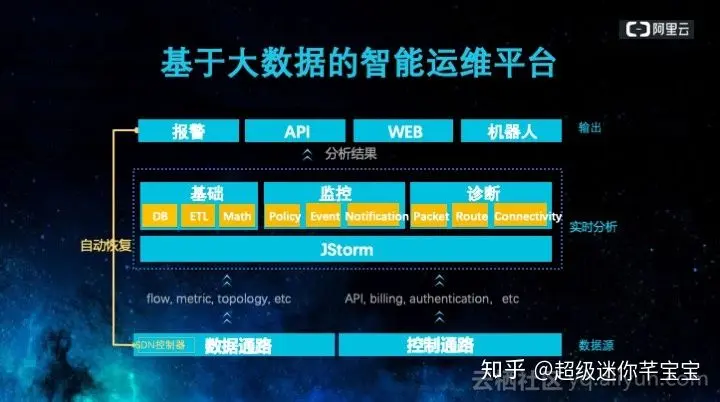 提到智能,就必须介绍阿里云基于大数据的智能运维平台,在阿里云内部叫齐天系统,通过数据面、控制面的各种数据收集,例如流数据、统计数据等等用户信息,收集到大数据的分析工具(JStorm)里面去对数据进行分类,我们分为基础数据、监控数据和诊断数据,对这些数据进行规则的匹配、运算,会将分析结果输送到各个界面,比如说报警、API、机器人等等,对于一些故障会进行故障隔离恢复,思路是差不多的。