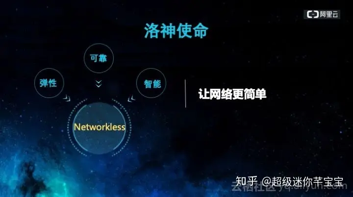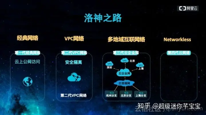 最后总结洛神的使命,洛神有三代,第一经典网络,主要是解决连通性的问题,第二代推出了VPC的网络用于安全隔离,当前是第三代,打通了接入云的解决方案,提供跟传统企业网络相同能力的能力,最后一个阶段阿里云定义为Networkless,最终的网络对最终用户其实是不可见的,就像阿里云网络的名称— 洛神,其实他像神一样你看不到他的存在,其实他也无处不在。
