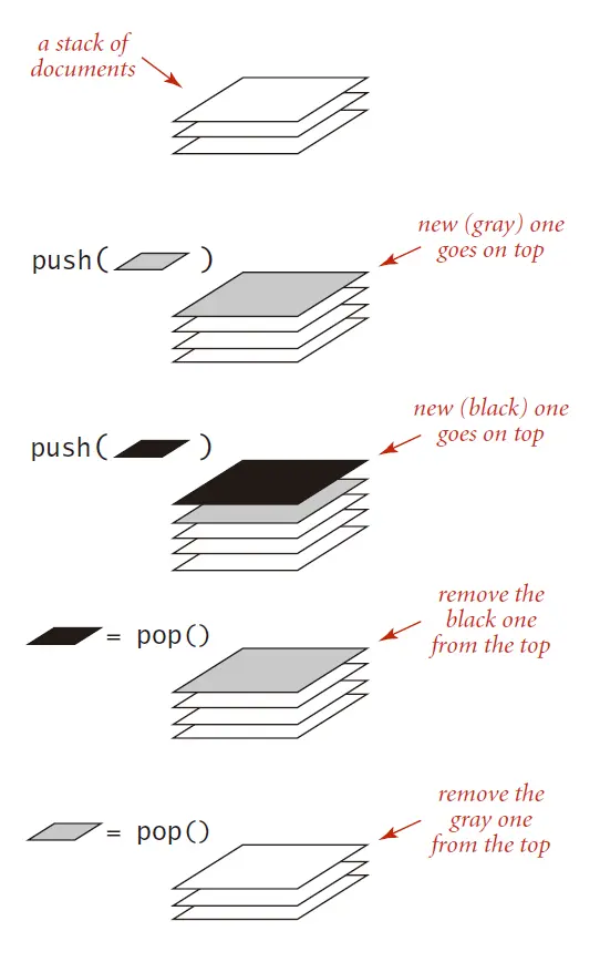 栈是一种后进先出(LIFO)的数据结构,如同摞书本一样,最先放的书本是最后才会拿到: