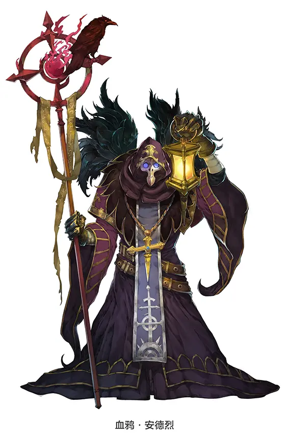 例如血鸦安德烈,这个誓灵是早期设计的一个。我们需要一个偏阴暗的黑暗魔法类誓灵,脑中第一反应就是乌鸦元素。这个元素在欧洲便是游走在生死之间的一种神秘动物,甚至可以说是象征着死亡的图腾。比如宗教裁判所有一种行刑官的面具便是乌鸦。所以我们结合了乌鸦和宗教文化等元素,设计了一个死而复生,能召唤鲜血鸦群的乌鸦亡灵形象,最终效果还是挺让人满意的。