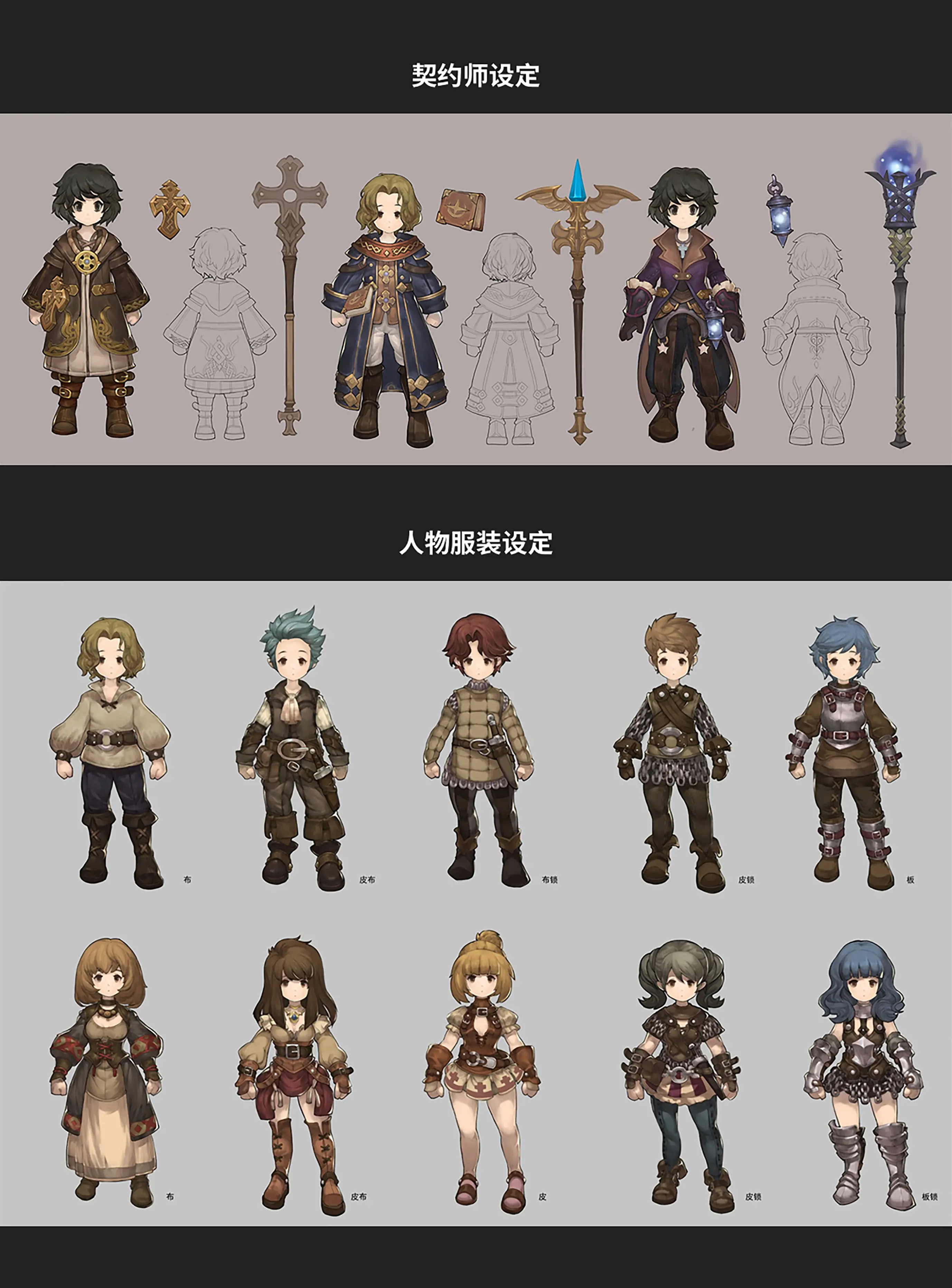 玩心游戏:其实,“契约师”类似某些概念中的召唤师,是通过魔法与“誓灵”签订契约,借助力量的职业,但与“誓灵”是更为平等的关系。所以表现出来的形象应该是更为平和友善的,并不需要过多的神秘性和侵略性。因此我们设计的契约师不再是阴暗神秘的兜帽遮头形象,而是拥有清新魔法师气质的少年男女。