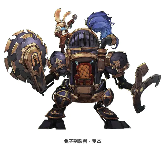 还有我们大家的“亲儿子”,暴躁可爱的游戏吉祥物兔子罗杰。因为游戏世界观是允许机械科技出现的,我们就考虑如何让冰冷的机甲有意思,最后想到安排了一只有点神经质的兔子去驾驶它。机甲设计结合了中世纪法式骑士甲的元素,而兔子是一个拿着扳手的科学狂人形象,也是比较有冲突性的结合吧。
