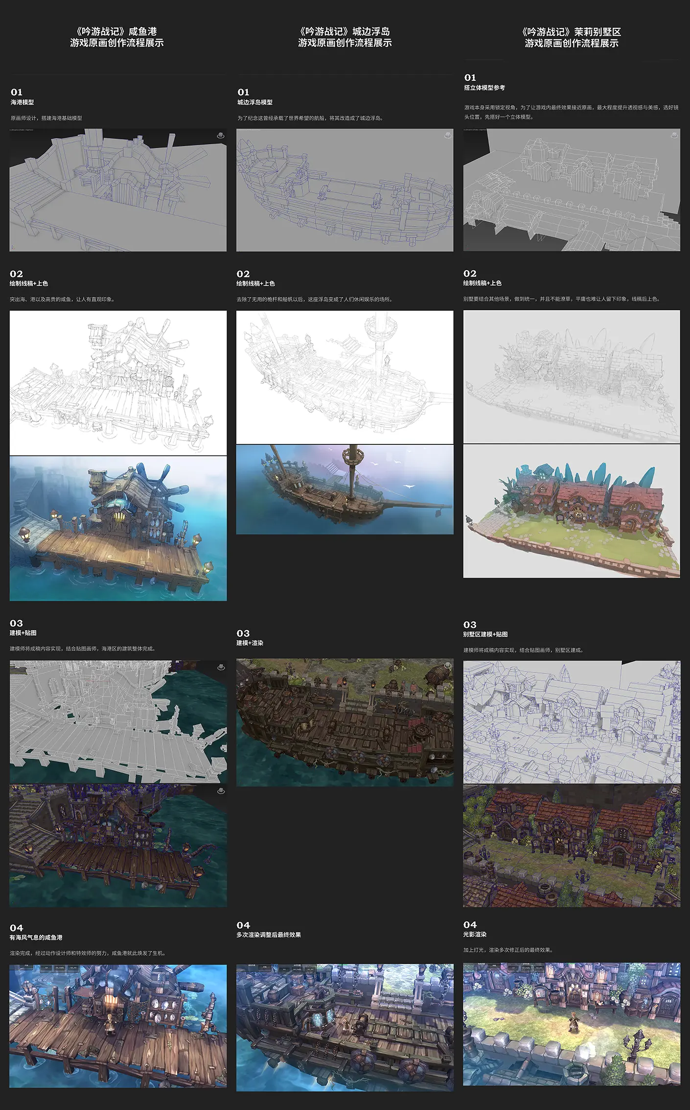 场景原画师负责的是所有游戏中需要的建筑、道具、室内外大大小小所有摆放物品等的设计和2D呈现。对应的3D场景模型师要根据场景原画进行每一个部分的3D实现、建模和绘制贴图。期间还是要和地形编辑师沟通确定每一处建筑的高低,大小,比例关系等等。三个部门配合进行实现场景效果的呈现。