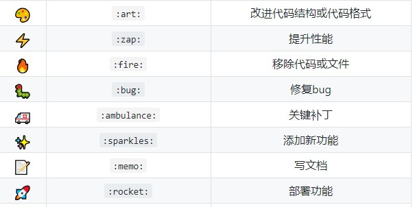 emoji emoji代码 说明 :art: :art:改进代码结构或代码格式 :zap: :zap:提升性能 :fire: :fire:移除代码或文件 :bug: :bug:修复bug :ambulance: :ambulance:关键补丁 :sparkles: :sparkles:添加新功能 :memo: :memo:写文档 :rocket: :rocket:部署功能 :lipstick: :lipstick:修改UI和样式文件 :tada: :tada:初次提交 :white_check_mark: :white_check_mark:添加测试 :lock: :lock:修复安全问题 :apple: :apple:修复macOS下的问题 :penguin: :penguin:修复Linux下的问题 :checkered_flag: :checkered_flag:修复Windows下的问题 :robot: :robot:修复安卓下的问题 :green_apple: :green_apple:修复IOS下的问题 :bookmark: :bookmark:发行或版本标签 :rotating_light: :rotating_light:移除linter警告 :construction: :construction:工作中 :green_heart: :green_heart:修复CI构建 :arrow_down: :arrow_down:降级依赖 :arrow_up: :arrow_up:升级依赖 :pushpin: :puahpin:将依赖项固定到特定版本 :construction_worker: :construction_worker:添加CI构建系统 :chart_with_upwards_trend: :chart_with_upwards_trend:添加分析或跟踪代码 :recycle: :recycle:重构代码 :whale: :whale:关于Docker的工作 :heavy_plus_sign: :heavy_plus_sign:添加依赖 :heavy_minus_sign: :heavy_minus_sign:移除依赖 :wrench: :wrench:更改配置文件 :globe_with_meridians: :globe_with_meridians:国际化和本土化 :pencil2: :pencil2:修改错别字 :hankey: :hankey:编写需要改进的错误代码 :rewind: :rewind:还原更改 :twisted_rightwards_arrows: :twisted_rightwards_arrows:合并分支 :package: :package:更新编译的文件或包 :alien: :alien:由于外部API更改而更新代码 :truck: :truck:移动或重命名文件 :page_facing_up: :page_facing_up:添加或更新许可证 :boom: :boom:引入重大变更 :bento: :bento:添加或更新assets :ok_hand: :ok_hand:由于代码审查更改而更新代码 :wheelchair: :wheelchair:改善可访问性 :bulb: :bulb:记录源代码 :beers: :beers:喝多了写的代码 :speech_balloon: :speech_balloon:更新文本和文字 :card_file_box: :card_file_box:执行与数据库相关的更改 :loud_sound: :loud_sound:添加日志 :mute: :mute:删除日志 :busts_in_silhouette: :busts_in_silhouette:添加贡献者 :children_crossing: :children_crossing:改善用户体验/可用性。 :building_construction: :building_construction:进行架构更改。 :iphone: :iphone:响应式设计 :clown_face: :clown_face:Mocking things(嘲笑???) :egg: :egg:彩蛋 :see_no_evil: :see_no_evil:添加或更新.gitignore文件 :camera_flash: :camera_flash:添加或更新快照 :alembic: :alembic:尝试新玩意儿 :mag: :mag:提升SEO :wheel_of_dharma: :wheel_of_dharma:关于Kubernetes的工作 :label: :label:添加或更新类型(Flow,Typescript)