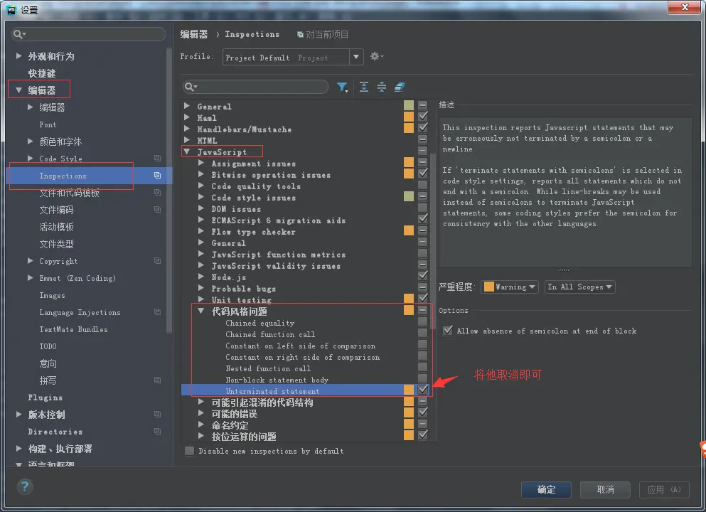 关闭webstorm(2017.3.5)的分号检测 kle 2018-12-06 2,014 阅读1分钟 有的代码风格是不加分号结尾的,这样会导致webstorm的分号检测警告,看起来很不好看,像这样:下面就来看一下怎么在webstorm关掉它:文件=》设置=》编辑器=》Inspections=》javascript(右侧)=》代码风格问题=》Unterminated statement(取消他就可以了)