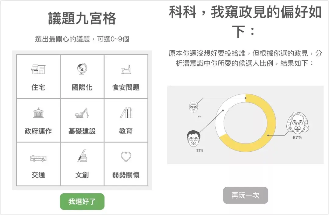 通过让人们填写问卷的形式,发现自己的政见可能与哪位候选人比较接近。通过回答问题这种游戏,让人们更清楚地了解自己的政治偏向,然后告诉用户,选择哪位候选人更加合适。