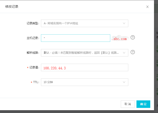 我用的是阿里云域名,其他的域名商也差不多的操作,下面以域名www.abc.com为例,linux服务器IP地址是100.200.44.31、首先添加解析记录,记录类型为A类型,主机记录填 * 号,记录值为你的linux 服务器ip地址