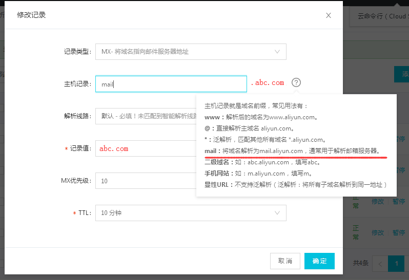 2、然后还要添加一条记录类型为MX的来指向你的搭建服务器的ip地址,主机记录写mail,记录值写abc.com,因为我们域名就是abc.com,MX优先级10,不用改