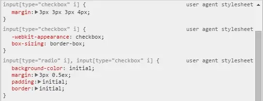 以上代码是为复选框未选中状态设置了宽高,边框背景等样式,注意这里的重点有两个,其一是我们已经讨论过的-webkit-appearance,把它设置为none的原因就是把它整个抹掉,我自己来画的意思。其二是font: normal normal normal 14px/1 FontAwesome,它为这个复选框定义了字体属性,为接下来的引用font-awesome作前提。