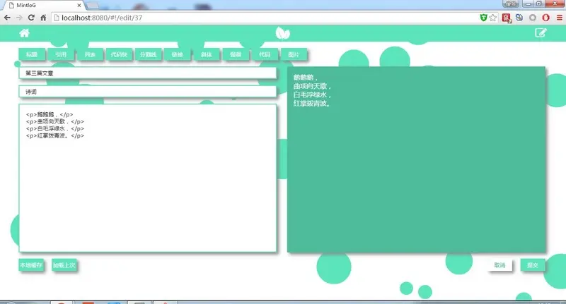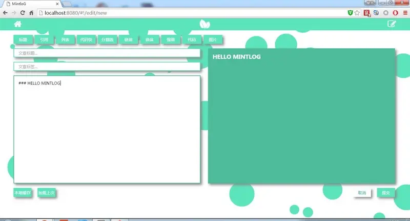 - 导航栏:左侧为“主页”按钮,可以快速回到首页;中间为MintloG的logo;右侧为编写按钮,点击以后可以切换到编写功能。