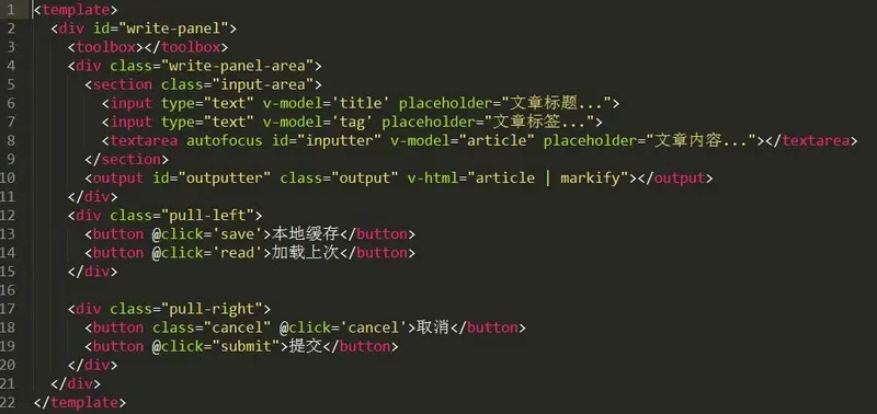 它加载了 toolbox.vue作为工具栏,然后可以进行文章的撰写与修改。这个编辑页面复用了我以前的一个项目Markcook,具体可以到这儿去看~ github.com/jrainlau/ma…