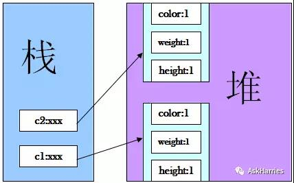 但c1和c2却永远不会相等,这是因为c1和c2分别为堆内存里面两只猫的引用对象,