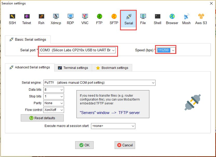 如同第2步,在「session setting」 对话框里选择serial,再选好串口号及波特率,点击OK就完成连接了。