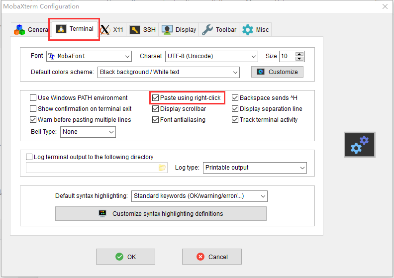 在Moba及很多终端工具里,都有这样的功能:鼠标左键划选复制文件,右键粘贴文本。但在Moba中右键粘贴功能默认不打开,我们可以手动打开。