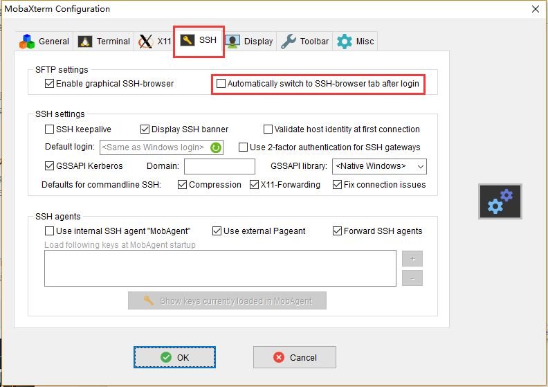 在菜单栏点击 「settings」 --> 「Configuration」,在弹出的对话框中选择 「SSH」,再将 「automaticall switch to SSH-browser tab after login」 前面的对勾去掉即可。