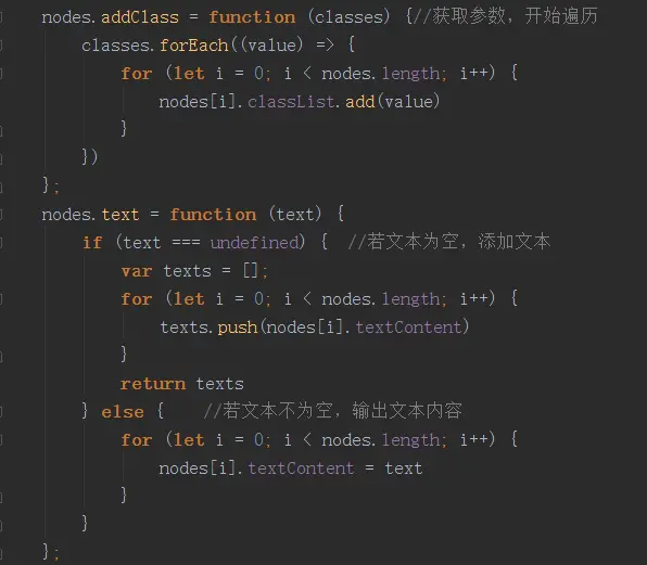 (2)分别通过forEach和for接收参数,并进行遍历,编写出两个方法:addClass()和text()。