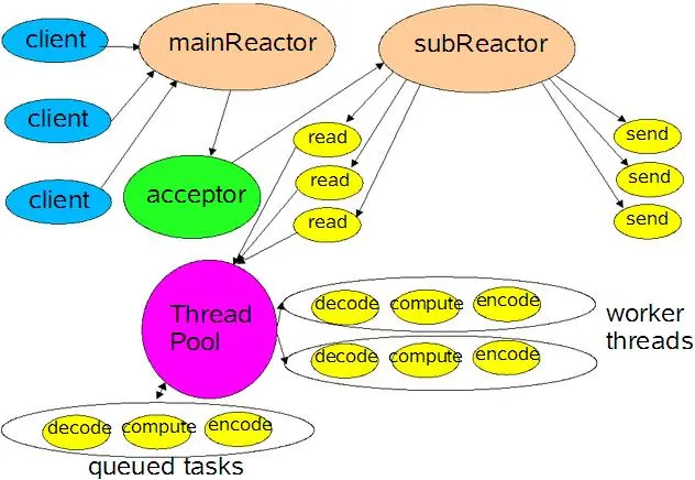 Acceptor接受连线后会给client绑定一个Handler并注册IO事件到Sub Reactor上监听,