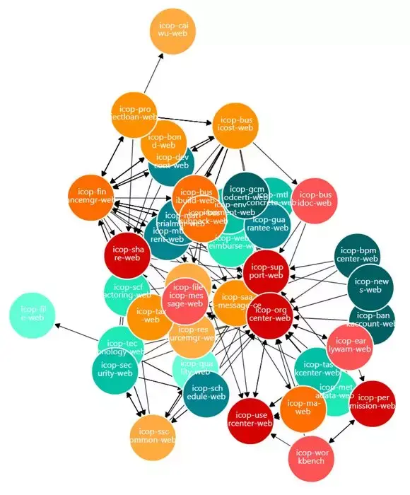 ·通过微服务依赖统计调用图分析出被严重依赖的微服务和频繁调用的微服务,如下图中的icop-orgcenter-web无论在被依赖程度还是被调用次数上都是第一,属于重点解耦和优化对象。