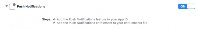 接下来,您需要在开发人员帐户中创建App ID并启用push notification entitlement。 Xcode有一个简单的方法:在仍然选择WenderCasttarget的情况下,单击Capabilities选项卡并将Push Notifications开关设置为On。