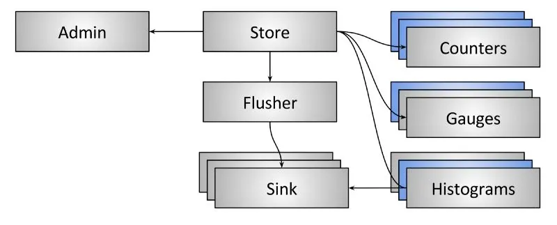 为了获得高性能,使用原子CPU指令在内部缓冲所有的状态变化。在可配置的间隔内,所有计数器和计量都被冲到flusher中。注意,在当前的架构中,直方图值直接发送到接收器。下面将更详细地描述这一点。Flusher在main线程中运行。