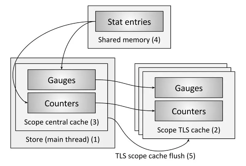 线程本地原子缓存: 在worker数量和吞吐量极高的情况下,单个stat值上的原子争用将成为一个问题。这可以通过移动到TLS计数器和压力表来解决,这些计数器和压力表在冲洗之前被聚集到中央存储中。