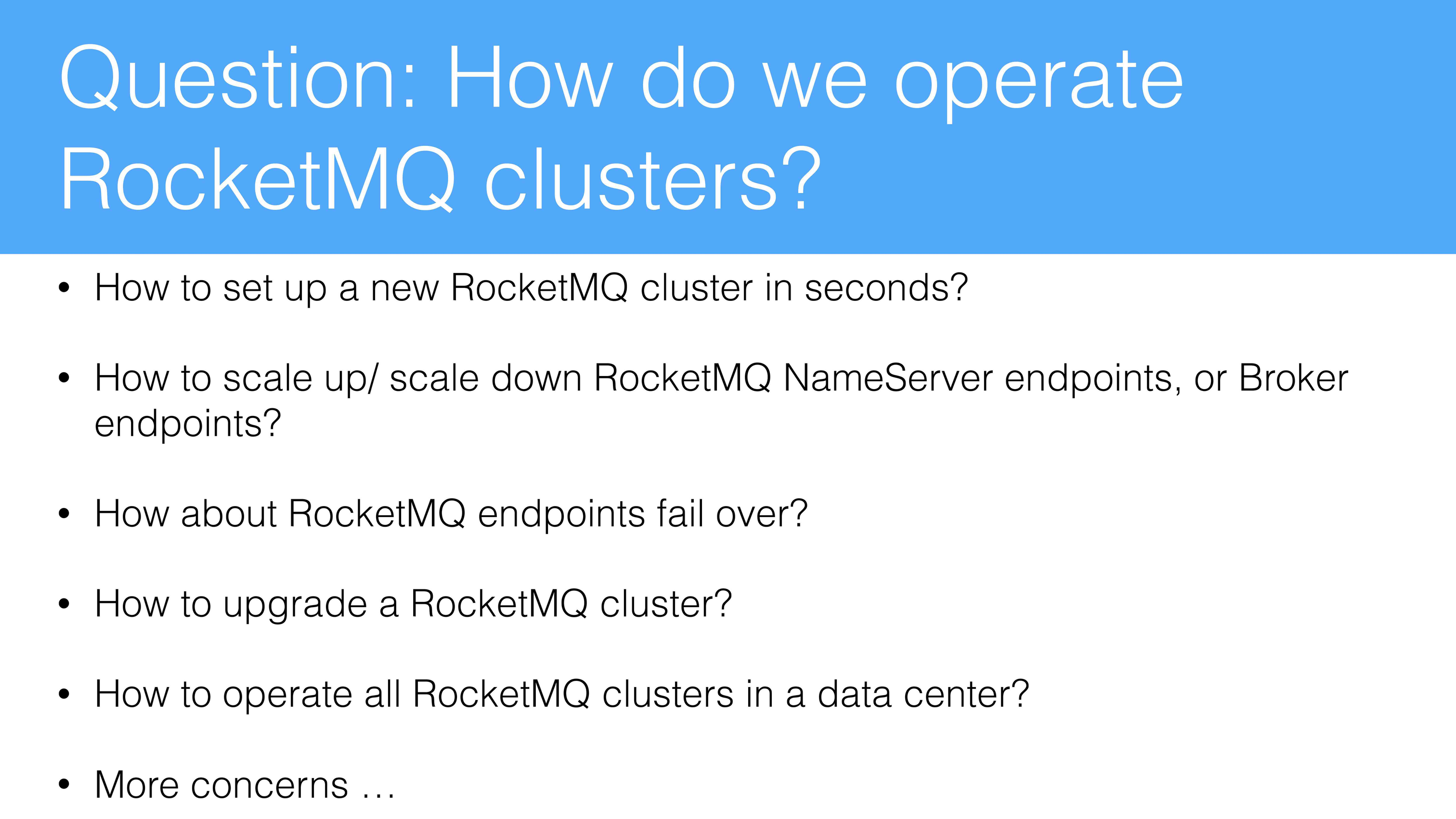 那么,假如我们身处这种场景,我们一般怎么运维?例如:如何能够秒级部署一个新的RocketMQ集群? 如何在业务无感知的情况下快速地增加或减少RocketMQ集群的NameServer或者Broker的实例数量? RocketMQ集群运行的过程中,假如其中一个或多个实例掉了,如何快速地恢复或者切换?如何更新RocketMQ集群版本? 以及如何去管理多个数据中心多个RocketMQ集群等等。
