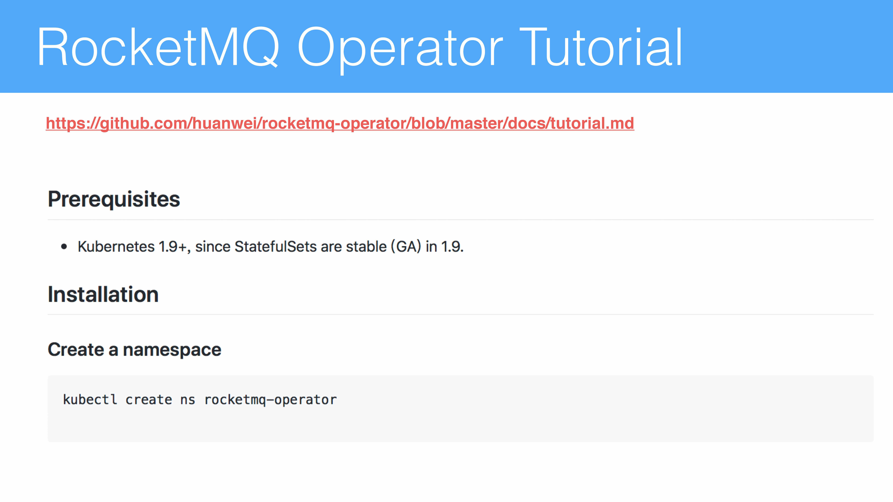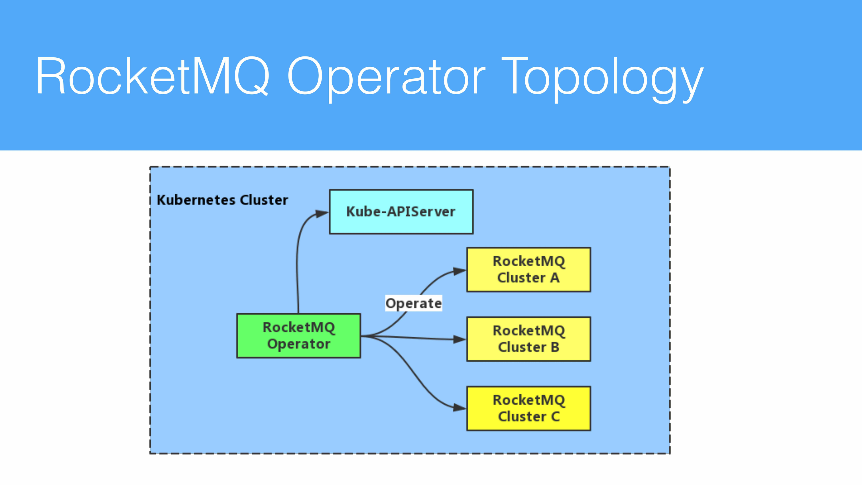 回到主题,什么是RocketMQ Operator?我给它起的口号是:“Create,operate and scale self-healing RocketMQ clusters on Kubernetes.”它是一个Go程序,跑在kubernetes集群内,能够帮助我们自动化地去运维每个RocketMQ集群的状态。